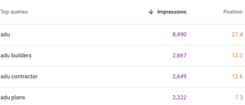 The keyword “ADU plans” would be ideal because it has received thousands of impressions and is currently ranked seventh.