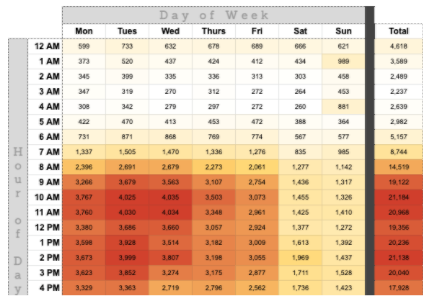 Export data to Excel and create a pivot table with rows and columns for each day of the week and hour.