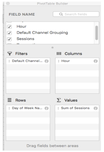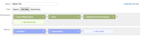 In Google Analytics, create a custom report called Flat Table. Choose Day of Week Name, Hour, and Default Channel Grouping to your dimensions so you can filter by traffic sources and choose sessions and transactions for your metrics.